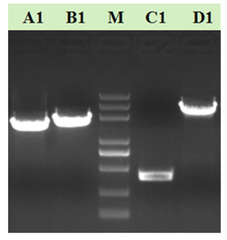 圖:使用本公司3’-RACE方法獲取了不同基因的3’-RACE PCR電泳結(jié)果(A1: 大腸桿菌某基因1600 bp,B1: 牡蠣某基因 1800 bp;C1:小鼠某lncRNA 460 bp;銀鯧某基因D1: 2600 bp)
