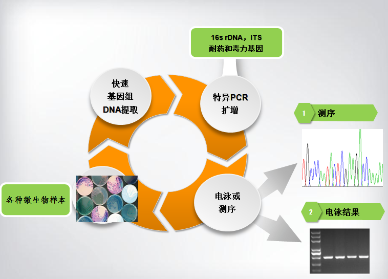 通過對細菌16rDNA可變區(qū)和真菌ITS區(qū)進行PCR擴增,然后測序和Blast分析,從而獲取微生物種類的準確鑒定;同時對多種微生物特異的毒力基因以及耐藥基因進行PCR擴增,進行致病菌株以及耐藥菌株的精確篩選。