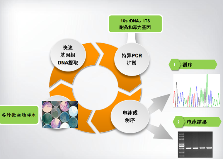 通過對細(xì)菌16rDNA可變區(qū)和真菌ITS區(qū)進(jìn)行PCR擴增,然后測序和Blast分析,從而獲取微生物種類的準(zhǔn)確鑒定;同時對多種微生物特異的毒力基因以及耐藥基因進(jìn)行PCR擴增,進(jìn)行致病菌株以及耐藥菌株的精確篩選。
